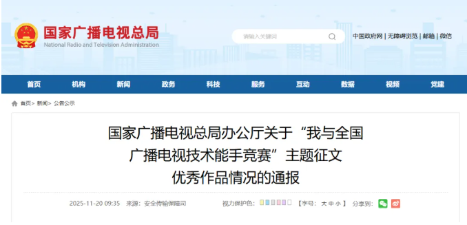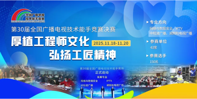 2025年11月24日 21:4911月18日至20日,第30屆全國廣播電視技術(shù)能手競賽決賽在北京成功舉辦。今年是競賽舉辦第30年,也是廣電總局首次與全國總工會聯(lián)合舉辦該賽事,具有特殊意義。本屆競賽共設(shè)網(wǎng)絡(luò)與數(shù)據(jù)安全、IPTV、中短波廣播、調(diào)頻和電視廣播四個專業(yè)方向,決賽共有來自43家單位的150名選手參加。